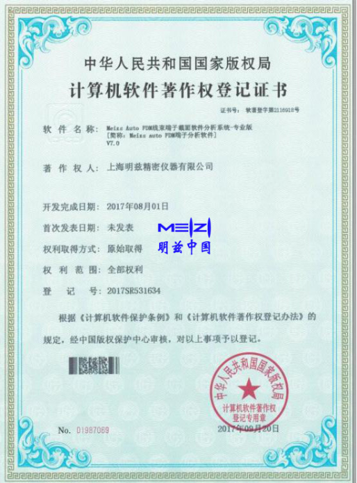 明兹公司保证严格遵守国家有关计算机软件产权保护方面的法律、法规,保证所使用的计算机软件是正版软件, 杜绝计算机中预装未经合法授权的软件。 明兹公司独立研发的压接线束端子截面分析软件系统已获中华人民共和国国家版权局颁发的证书。